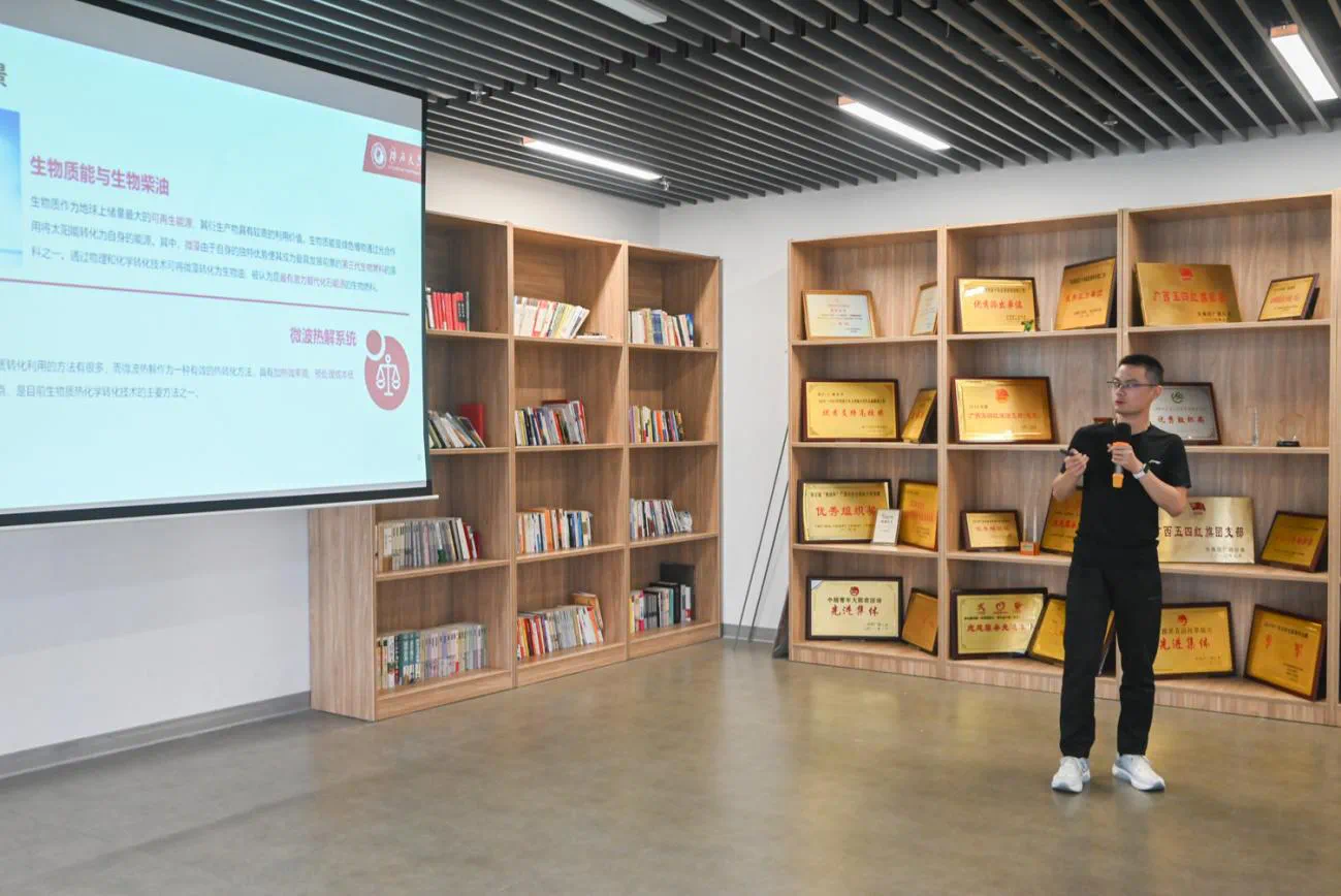 会议开始,李道洋副书记向来自各个高校的研究生表示欢迎,并表示,“双碳”战略对于预防世界气候风险、维护我国气候安全和引领世界绿色经济的复苏有重大影响,目前,我国将“双碳”战略纳入社会主义现代化强国生态文明建设的整体布局,在发展和减排中寻找平衡点,走习近平总书记提出的高质量发展之路,也为培育符合时代需求的复合型人才提出了新要求。因此,希望驻邕各高校相关前沿学科的同学们开展学术交流,汇报各自方向的研究成果,为与会同学未来的学术研究和工作实践提供新的思路和启示,为“双碳”战略贡献智慧。